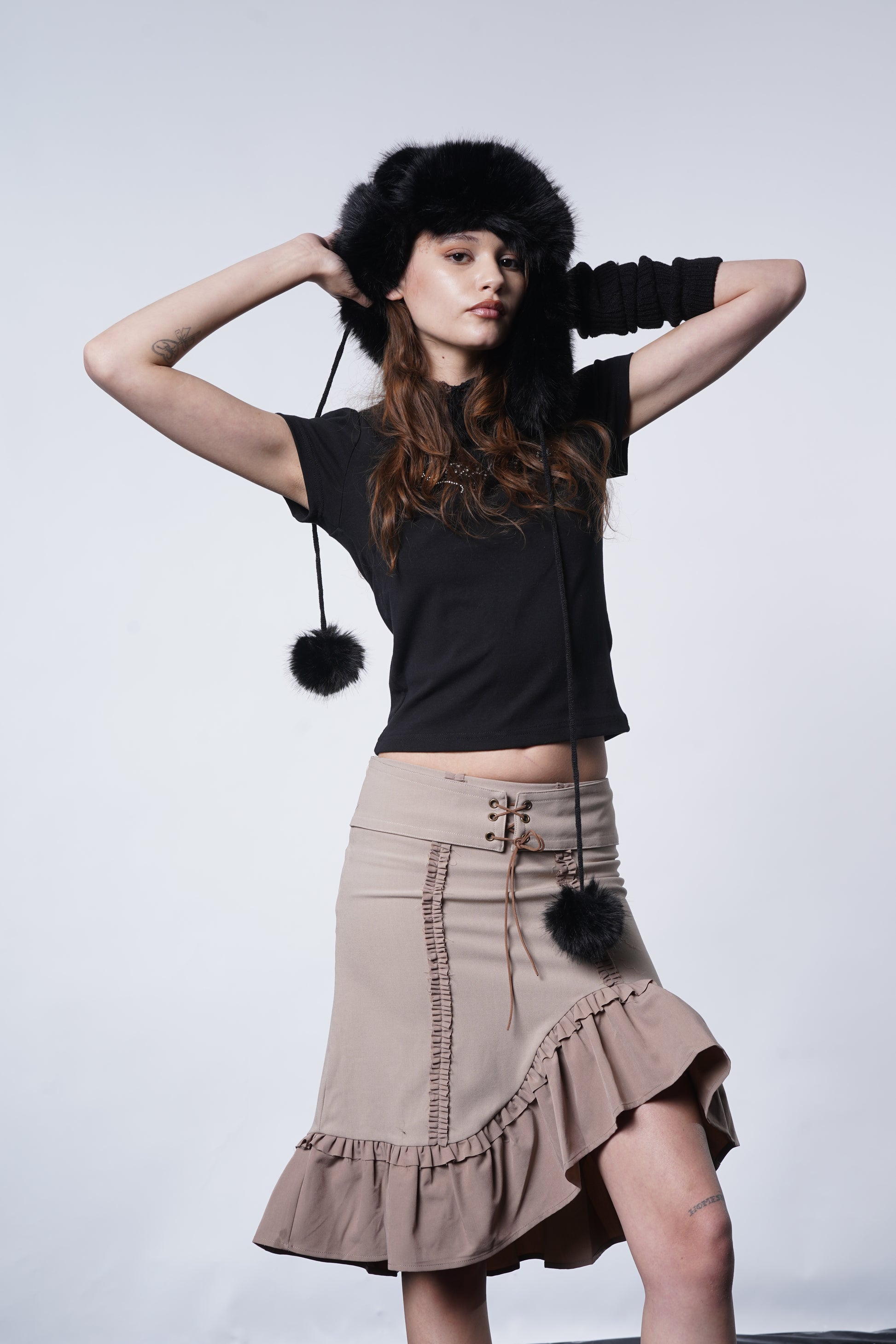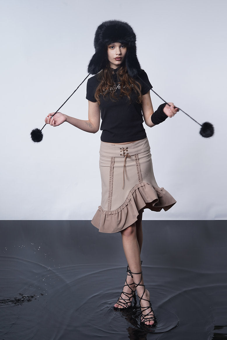 Attic Doll Midi Skirt cuz love is like a flower, destined to wither. This mid-rise midi skirt has raw edge ruffle trims, a ladjustable eyelet ribbon tie, an asymmetrical hem,and a side zip closure.