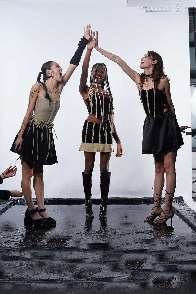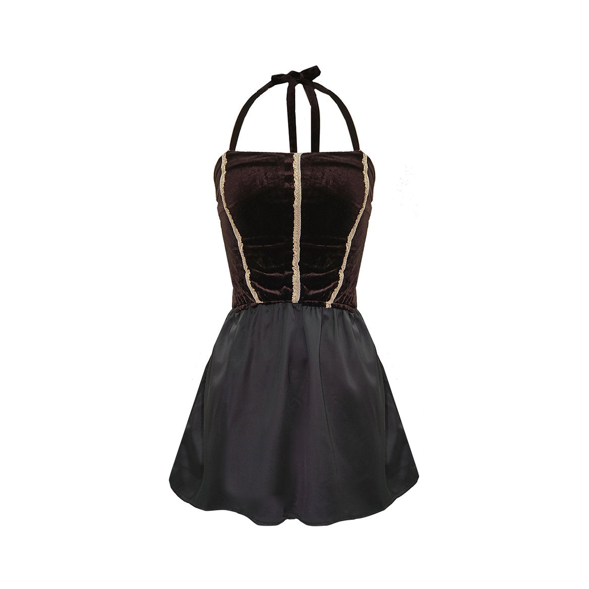 Mini dress from Zemeta with a velvet bodice and a satin skirt. Design details include a fitted corset-inspired bodice with halter straps and adjustable ties at the back that pairs with a sleek a-line mini skirt. Finished with ruffle detailing at the front.