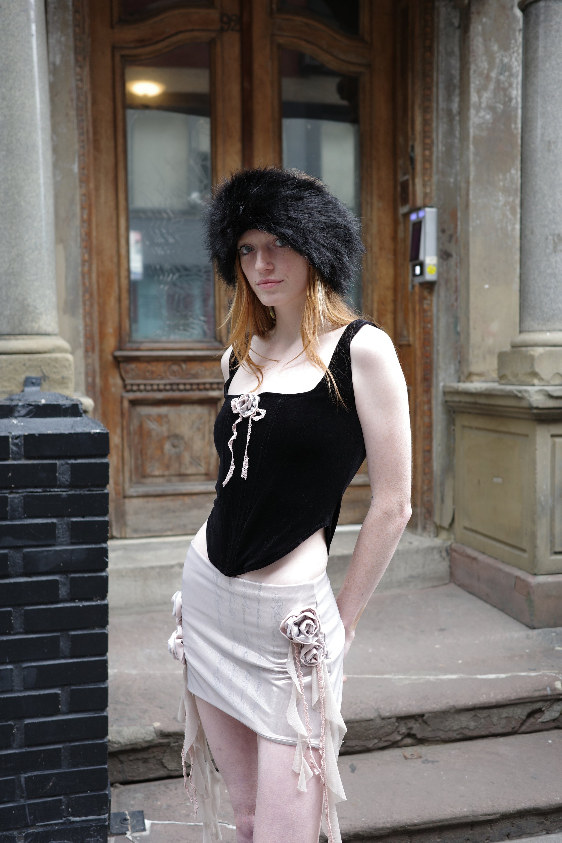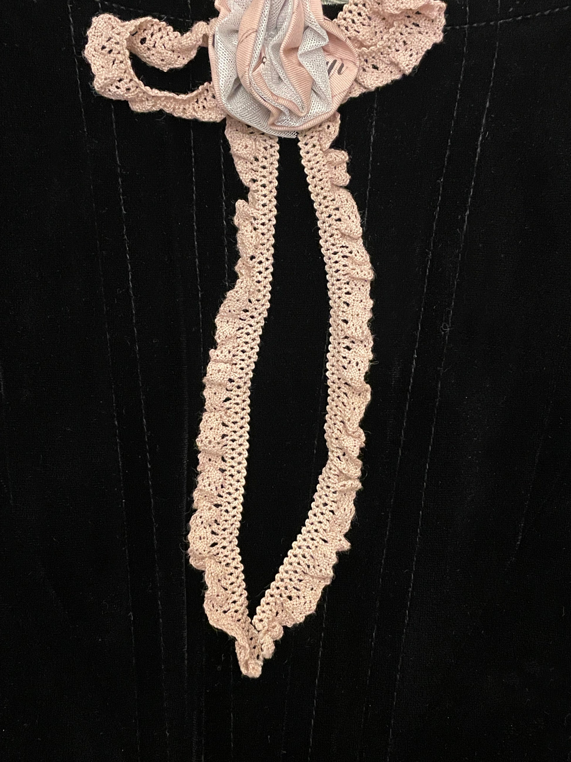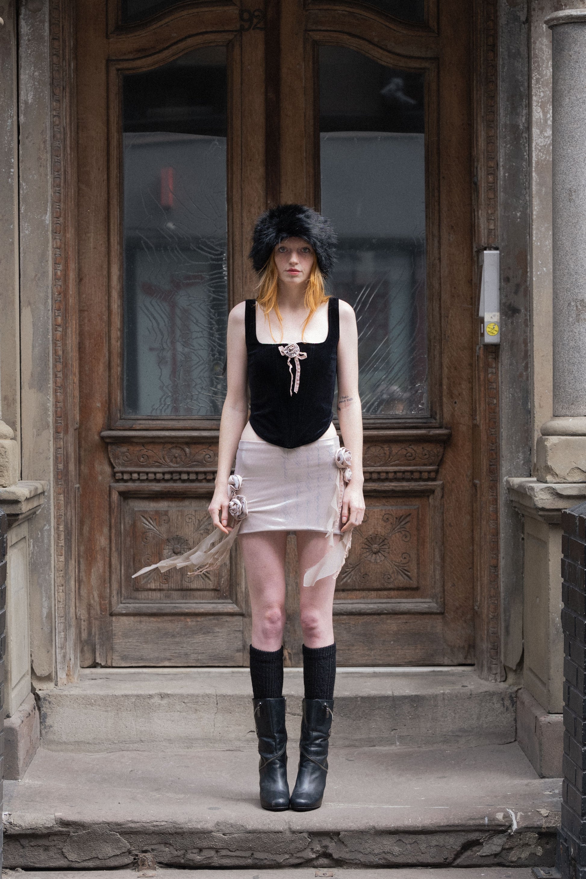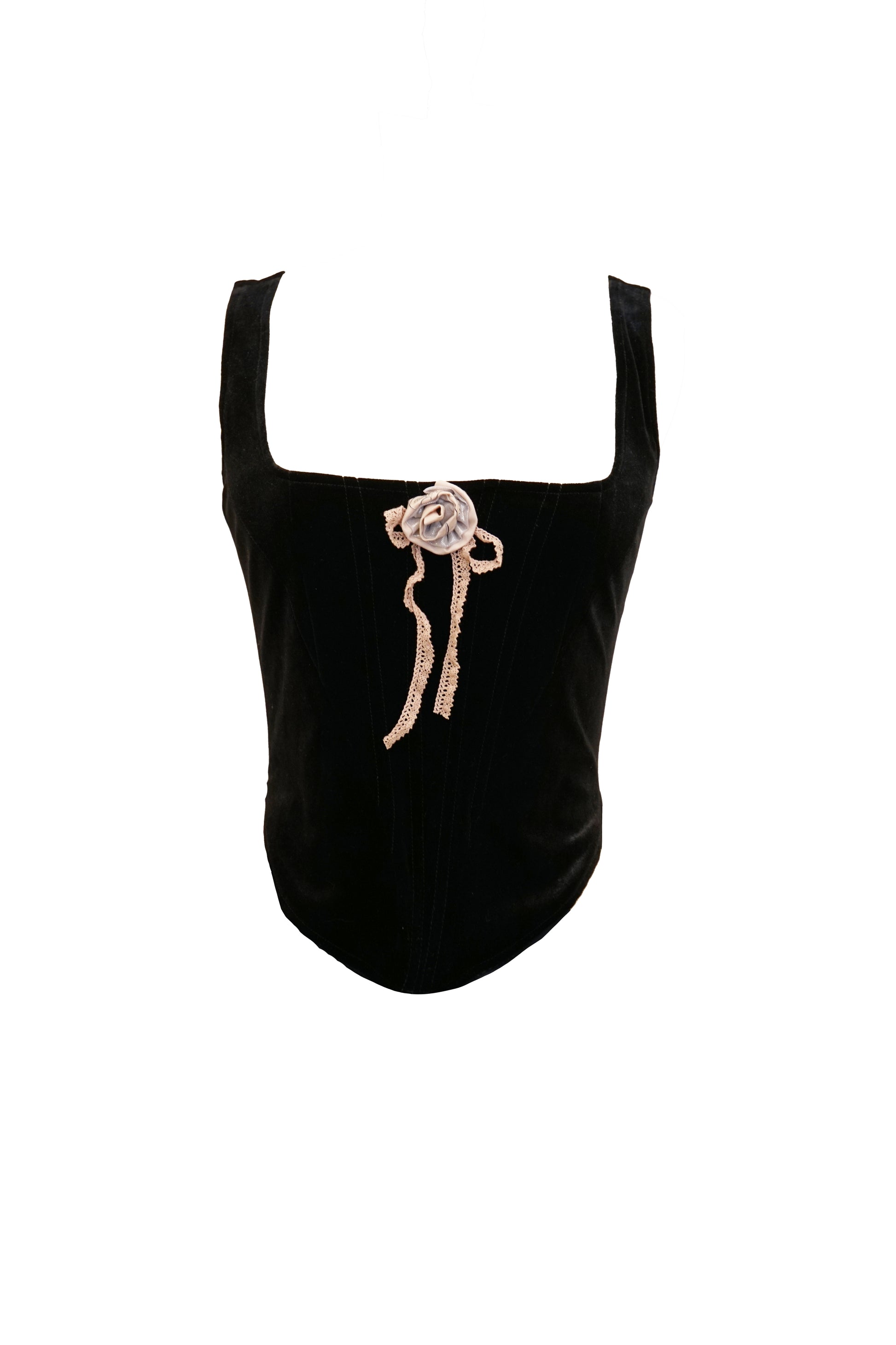 Slip into pure elegance with this stunning black velvet corset that whispers sophistication. Luxurious velvet hugs your curves while delicate fabric roses and intricate lace details add a touch of romance and whimsy. Perfect for making a bold statement at special events or elevating your everyday style with unexpected glamour.