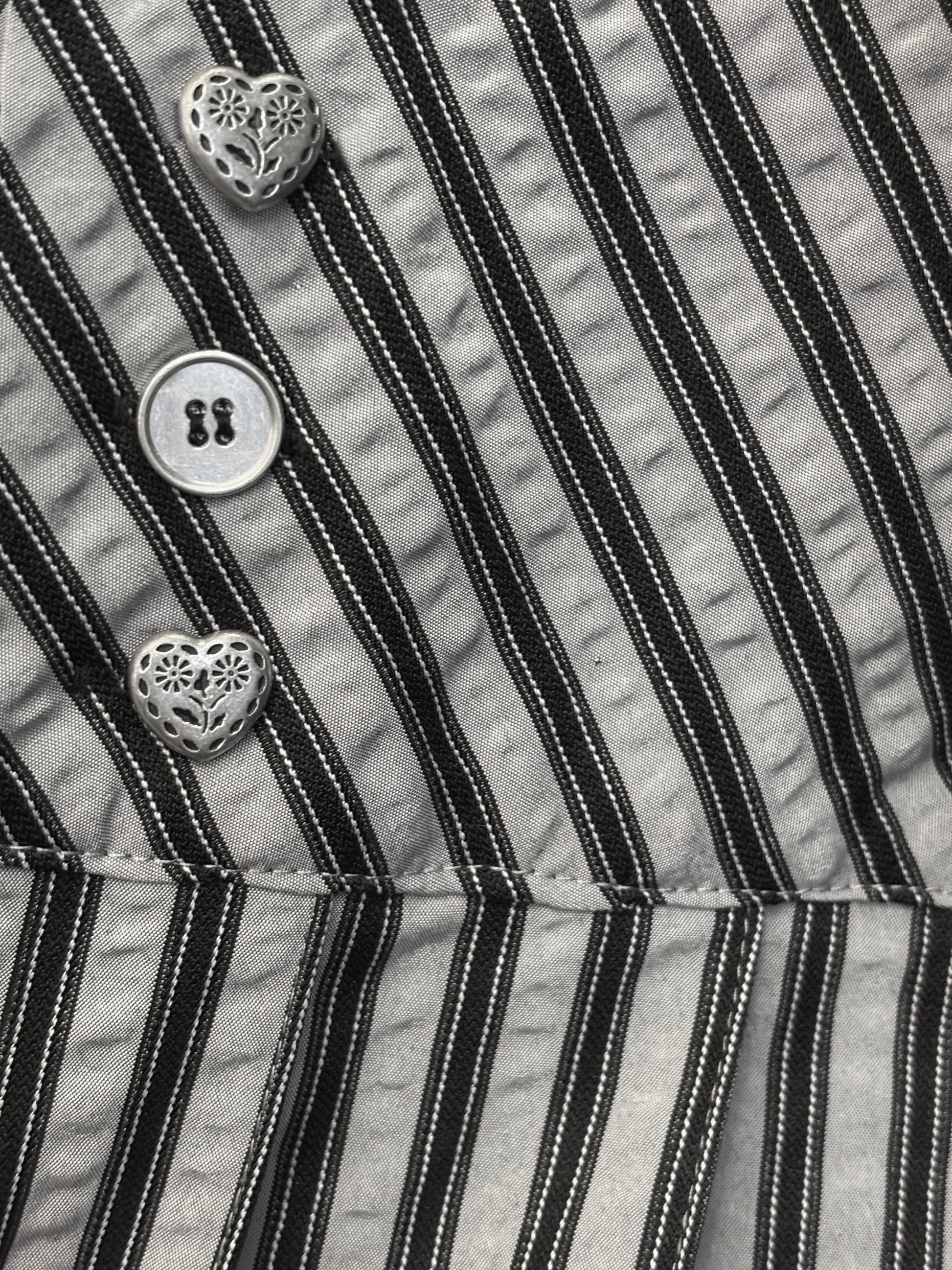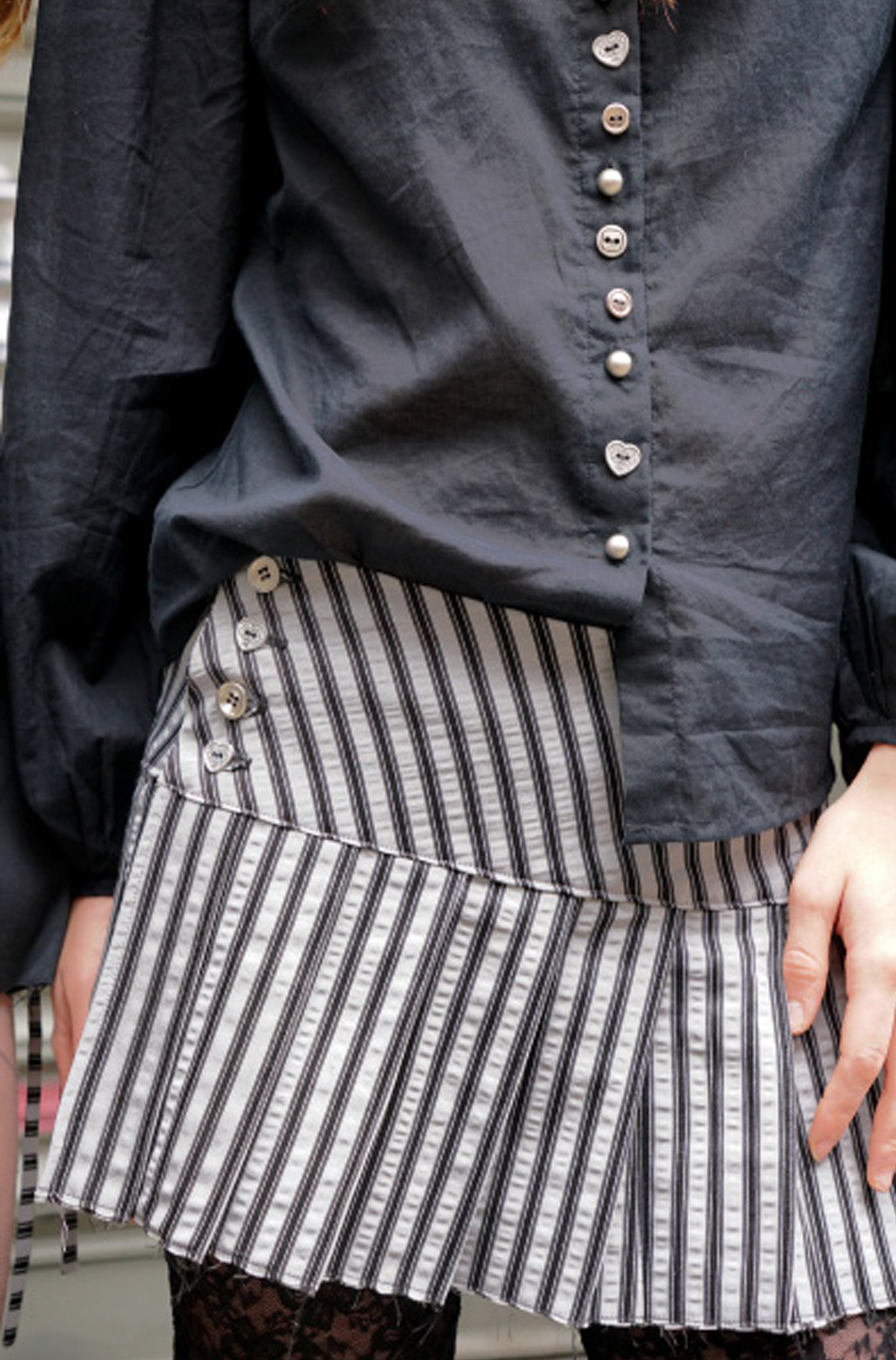 Elevate your everyday style with this pin stripe button skirt—a playful twist on a classic! Crisp vertical stripes create a flattering silhouette, while the unique button detail adds personality and charm.