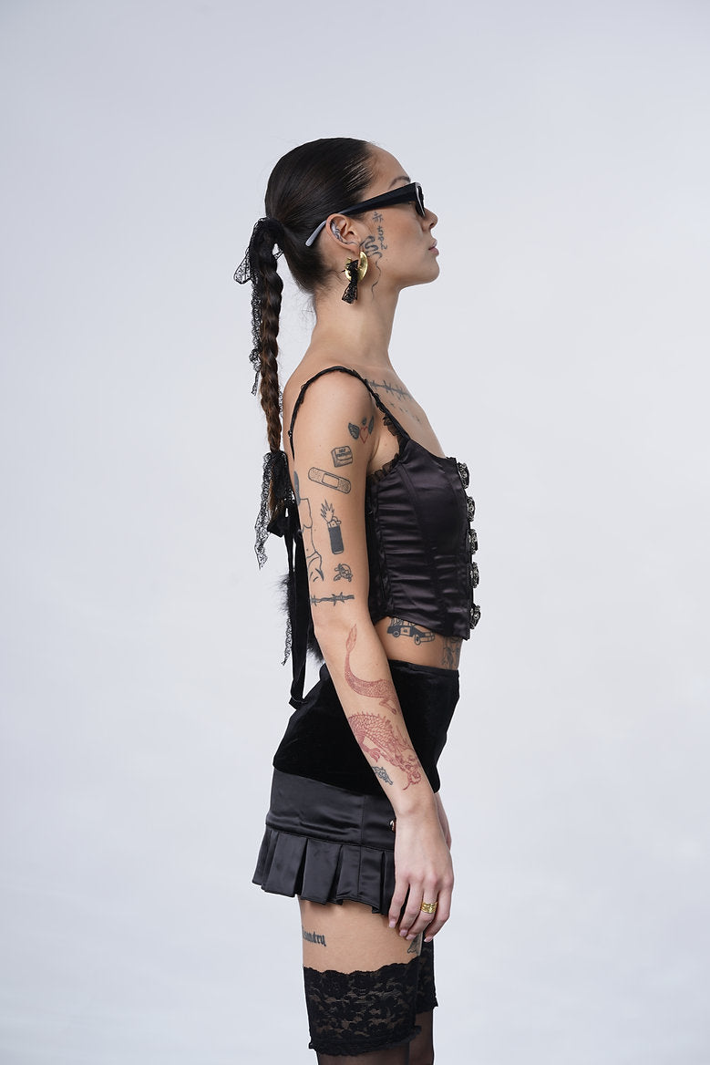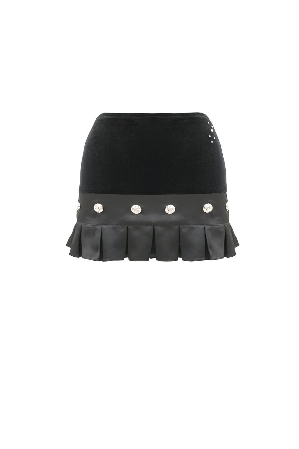 Snow Drop Velvet Skirt cuz you've got 'em calling out your name. This mini skirt has a velvet construction, satin pleated design, silver stud buckle detials.